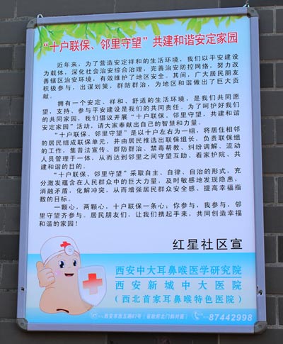“十里联保邻里相望”,共建合谐安定家园。2012年11月1日,西安中大耳鼻喉医院热衷做社区文明宣传先锋,与社区合作共同制作宣传墙体。居民们也纷纷表示像“十里联保,邻里相望”这种关注居民安全,考虑居民民生的标语深受欢迎。